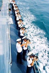 Navy cadets receive training on board the training vessel "Zhenghe" . The photo is taken in July, 2004. [newsphoto/file]