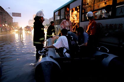 Chinese firefighters help to evacuate residents using a raft in a flooded