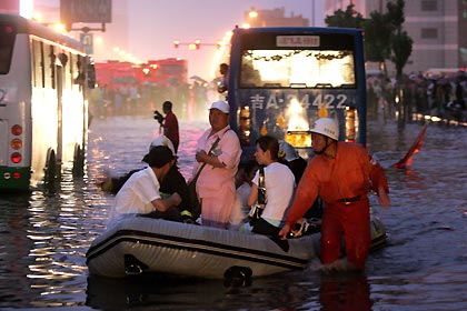 Chinese firefighters help to evacuate residents using a raft in a flooded