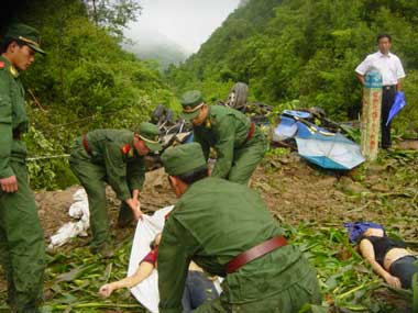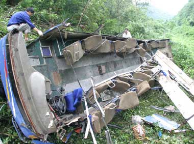 A passenger coach, running from Kaixian in southwest China's Chongqing to Guangdong Province, slipped off a mountain highway and crashed into a deep valley in Enshi, Hubei Province July 16, 2005. Seventeen were killed, and 37 were injured, including 17 students aged below 15. The injured are treated in a local hospital and the accident is still under investigation. [newsphoto]