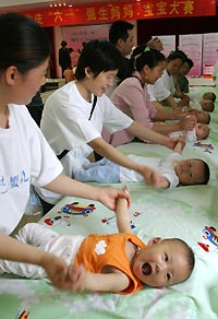 Mothers learn how to do exercises for their babies under the instruction of medical workers in Jinan of  Shandong Province. [newsphoto]
