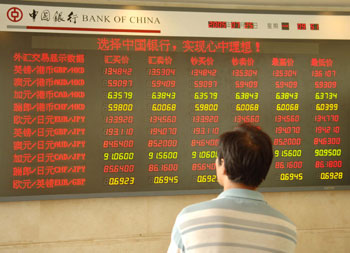 A man looks at an electronic board that show latest foreign exchange rate at a Bank of China branch in Wuxi, East China's Jiangsu Province July 25, 2005. [newsphoto]