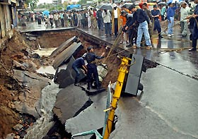 | Indian workers lift a motor scooter after a road caved in due to