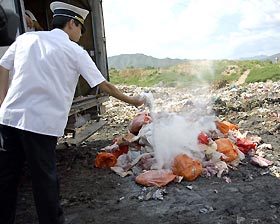 enforcement officer scatters disinfectant prior to burning a pile of pork
