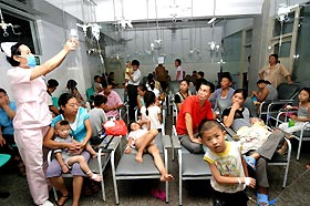 Parents accompany their children to receive drip infusions yesterday in Xuchang County, Central China's Henan Province. The hot weather has caused some children to develop respiratory infections, colds and even pneumonia. The number of patients, most of them children, has kept rising along with scorching temperatures across the country. [newsphoto]
