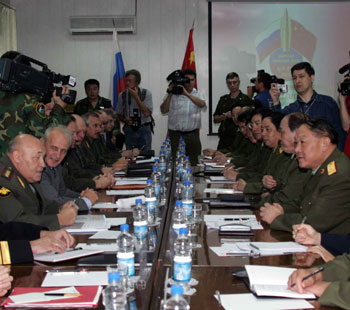 Chinese and Russian defense officials hold a strategic consultation on their joint military exercise in Vladivostok, Russia, Thursday, Aug. 18. 2005. Russia and China launched unprecedented joint military exercises Thursday involving air, sea and land forces. [Xinhua]