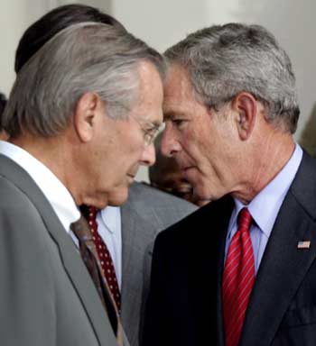 Secretary of Defence Donald Rumsfeld cross paths after Bush spoke in the