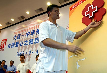 China's basketball star Yao Ming hangs the emblem of China's Red Cross at a promotional ceremony in Beijing on September 4, 2005. Yao attends the ceremony to promote among colleges students the donation of hemopoietic stem cell, the only known effective treatment of leukaemia. [newsphoto]