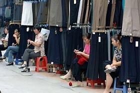 | Chinese vendors wait for customers at a clothing market in Hefei,