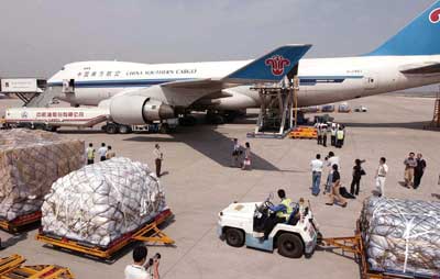 plane in a Beijing airport September 7, 2005. The goods include power generators, tents, bed sheets and
