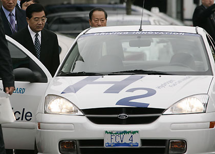 President Hu Jintao (L) looks over a hydrogen-powered car while visiting