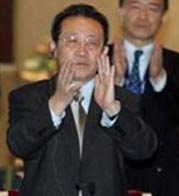 negotiator Kim Gye Gwan, center, applauds at the close of the talks over