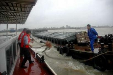 Chinese soldiers help a fisherman dock his boat in Hongze county, east China's Jiangsu province, September 12, 2005. At least 14 people have been killed and more than a million evacuated by Monday after Typhoon Khanun, the 15th typhoon of the year, slammed into the Chinese mainland on Sunday. Picture taken September 12, 2005. [newsphoto]