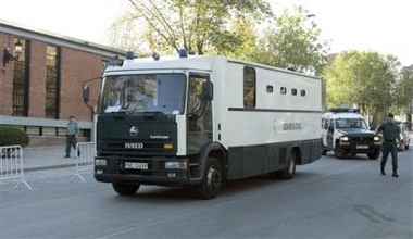 A prison van, believed to be carrying at least one Al-qaida suspect, arrives at the National courthouse in Madrid Monday Sept. 26, 2005. Spain's National Court hands down the verdict in Europe's biggest trial of 24 Al-Qaida suspects Monday, including three who sentences of nearly 75,000 years each for allegedly helping plot the Sept. 11, 2001 attacks in the United States. [AP]