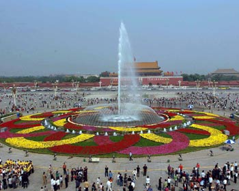 Visitors look at newly installed fountains and flowers on the Tian'anmen Square in central Beijing September 27, 2005. China will be celebrating the National Day October 1. [Xinhua]