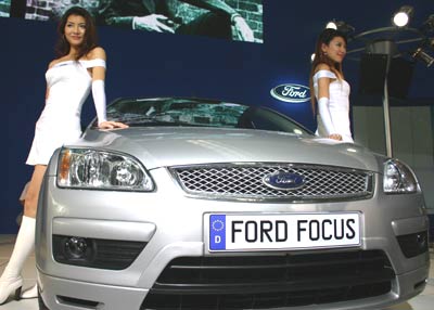 A model poses beside a Ford Focus sedan at the