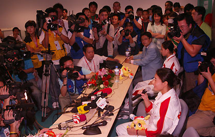(Above) Olympic champions Guo Jingjing(C), Wu Minxia(L) and Li ting wave after the event of three-meter sprintboard at the 10th National Games in Nanjing on September 30, 2005. Guo seized the gold as Wu the silver. (Below)They attend the press after the match. [newsphoto]