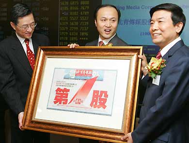 Advertising department head Yu Dagong and two of his subordinates were being held on suspicion of bribery while another employee of the department and Vice Presidents Zheng Yijun and Niu Ming were detained for unspecified reasons, Beijing Media said in a statement late Monday. All six have been suspended and the company planned to conduct its own investigation and assess any financial impact, the statement said. Beijing Media is the advertising arm for the Beijing Youth Daily, the Chinese capital's second biggest-selling newspaper. The company listed its shares in Hong Kong in December after selling a 25 percent stake to the public, marking the first time that China's government allowed outsiders to own stock in its tightly controlled media industry. Beijing Media in August reported earnings of 170,000 yuan (US$21,000; euro17,630) in the first half of 2005, a drastic drop from the 66.3 million yuan it posted in the six months ending June 2004. The company had warned that its first-half results would be hurt by Chinese government controls on property projects _ a major source of the company's revenue. Beijing Media shares were suspended Monday following a magazine report on the investigation into the company. The company has applied to resume trading Tuesday.