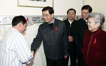 hands with an AIDS patient in You'an Hospital in Beijing in this November