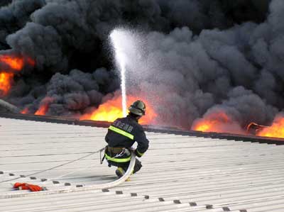 A fireman tries to put out a fire at a packing material company in Luquan, north China's Hebei Province October 14, 2005. Some 100 firefighters were able to extinguish the blaze after about 10 hours. Several thousands square meters of company workshops were destroyed in the fire, but no casualties were reported. The cause of the fire is still under investigation. [newsphoto]
