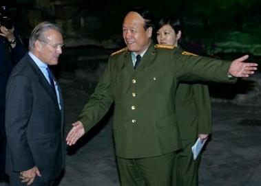 Chinese Vice Chairman of the Central Military Commission Guo Boxiong, right, shows the way to U.S. Defense Secretary Donald Rumsfeld, left, at the Diaoyutai State Guesthouse in Beijing on Wednesday October 19, 2005. [AP]