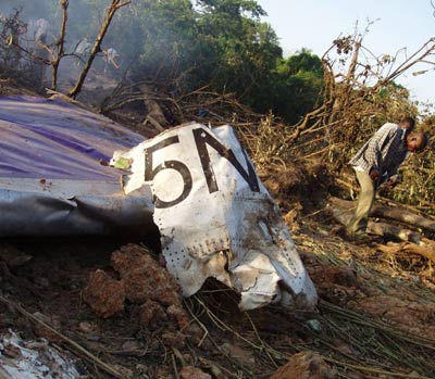 Wreckage is strewn at the crash site of a Nigerian airliner at Ijoko Ota in south western Nigeria, October 23, 2005. Nigerian airliner with 117 people aboard crashed and disintegrated in flames shortly after take-off from Lagos and there was no sign of survivors, officials and the Nigerian Red Cross said on Sunday. [Reuters]