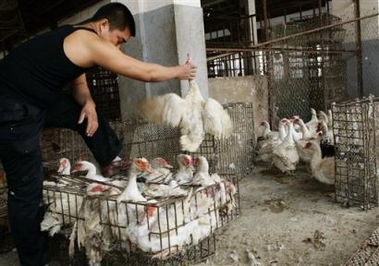 A Chinese man carries live ducks at a wholesale market in Shanghai, China, Monday, Oct. 24, 2005. China's capital is stepping up efforts to prevent the spread of bird flu to humans by securing its borders and sending inspectors to farms, homes and markets, state media said Monday. [AP]
