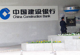 man stands next to branch of China Construction Bank in Shanghai on October 24, 2005.