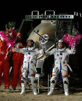 (L) and Nie Haisheng wave flowers beside the re-entry capsule of China's