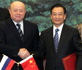 Premier Wen Jiabao (right) shakes hands with his Russian counterpart Mikhail Fradkov at the 10th Sino-Russian Prime Ministers' Meeting in Beijing. [Xinhua]