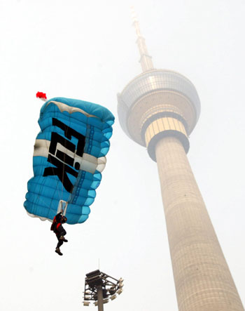 A parachuter prepares to land after jumping off from a TV transmission tower in Beijing, November 4, 2005. A total of 20 top parachuters from 10 countries are competing in the low altitude parachuting competition in Beijing. [newsphoto]