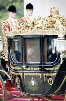Britain's Queen Elizabeth travels with Chinese President Hu Jintao on a horse-drawn carriage on Horse Guards Parade in London November 8, 2005. [Reuters]