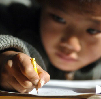 A pupil from a primary school, mainly for children of rural laborers working in Harbin, capital city of Northeast China's Heilongjiang Province, does his homework on his shabby desk with a tiny piece of pencil stub November 3, 2005. Most children in this school are from low-income migrant workers' families. The children wear threadbare clothes and use poor stationeries so as not to ask their families for money to buy new ones. It was found in a physical checkup that many of the 300 students even don't have socks and underwears and sometimes don't have money for lunch. The government, institutions and citizens are joining hands to help children from poor families to receive education. [newsphoto]