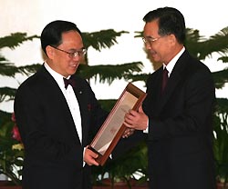 | Chinese Premier Wen Jiabao (R) hands new Hong Kong Chief