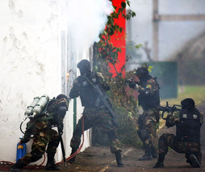 Armed police officers take part in an anti-terror drill in Chengdu, Southwest China's Sichuan Province Friday November 18, 2005. More than 1,700 police and armed police officers participated in the exercise. [Xinhua]