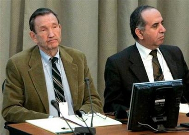 and defence lawyer Issam Ghazawi sit in the court room at Saddam's trial