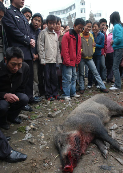 Students look at a dead wild boar at a middle school in Xiangfan, Central China's Hubei Province November 30, 2005. The boar broke into the school in the early morning before being shot dead by local police. How the wild animal came to the school in the city center is still unknown. [newsphoto]
