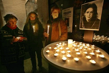 kidnapped archeologist Susanne Osthoff as they stand next to a picture of