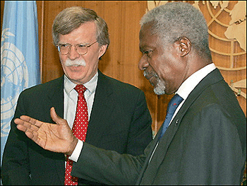 UN chief Kofi Annan(R) and US Ambassador John Bolton meet at the UN Headquarters in New York City, August 2005. Annan and Bolton sparred over the stalled UN budget and the slow pace of planned reforms amid fears that the impasse could lead to a 'financial crunch'[AFP]