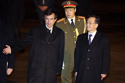 Premier Wen Jiabao (R) is greeted by France's Foreign Minister Philippe