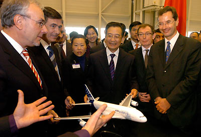 Premier Wen Jiabao (C) holds a model of the Airbus A380 plane during a visit