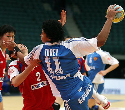 Emilia Turey (R) of Russia leaps past Korea's Sun-Hee Woo during their match at Women's World Handball Championships in St. Petersburg, December 12, 2005. [Reuters]