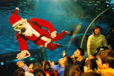 A worker dressed as Santa Claus waves to visitors as he swims underwater in a fish tank at the Nanjing Marine World amusement park in East China's Jiangsu Province, December 14, 2005. [Newsphoto]