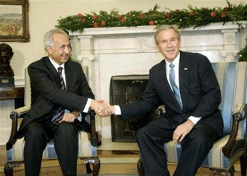 President Bush shakes hands with Iraqi Ambassador to the United Nations, Samir Shakir al-Sumaydi in the Oval Office of the White House, Friday, Dec. 16, 2005 in Washington. [AP]