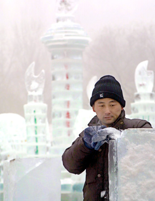 An ice sculptor from northeast China puts final touches to one of his works in a park in Urumqi, northwest China's Xinjiang Uygur Autonomous Region December 18, 2005. The city is erecting different ice sculptures at different sections of the city to greet visitors and residents. [newsphoto]