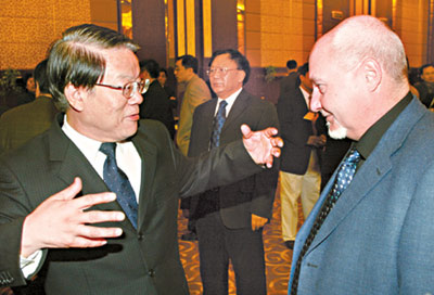 the State Council Information Office, chats to Gennady Krivosheev, bureau