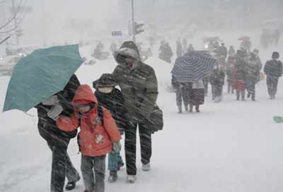 Freezing residents trudge through the snow in Weihai, East China's Shandong Province, Wednesday morning, December 21, 2005. [newsphoto]