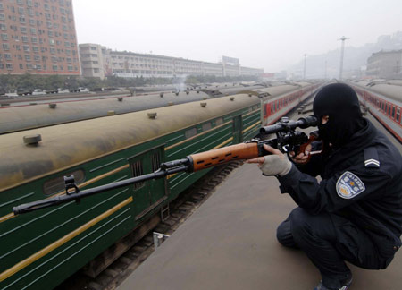 A sharp-shooter takes part in an anti-terror exercise on a railway line in Southwest China's municipality of Chongqing Tuesday January 10, 2006. China steps up railway security as the Spring Festival travel peak comes. [Xinhua]