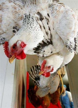 Live chickens hang from hooks at a slaughterhouse in Andenne, southern Belgium, October 27, 2005. [Reuters]