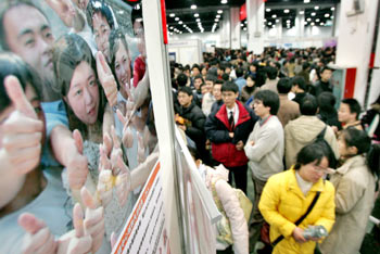 College graduates look at employment information at a job fair in Hangzhou, East China's Zhejiang Province January 19, 2005. Some 4.1 million university students are expected to finish their college studies and enter the job market in China in 2006, 700,000 more than that of 2005. [Xinhua]